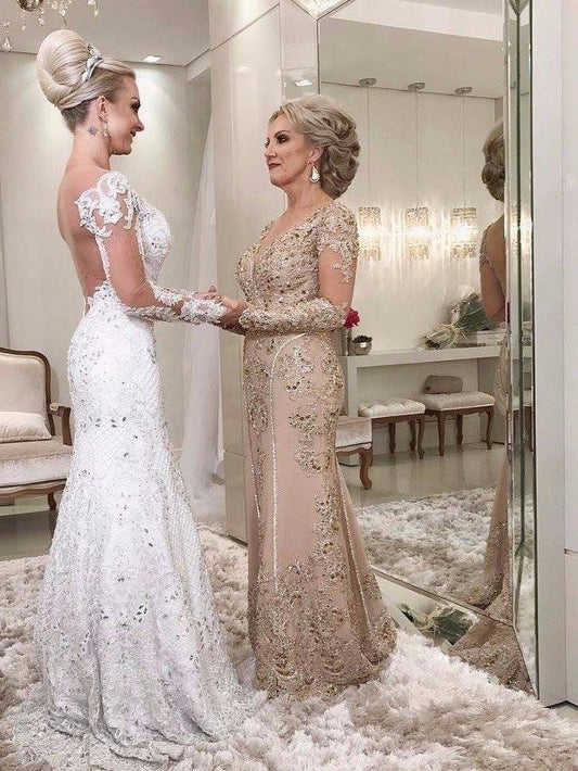 Golden Brautmutterkleider Spitze Mit Ärmel Günstig Abendkleider für Hochzeit Online